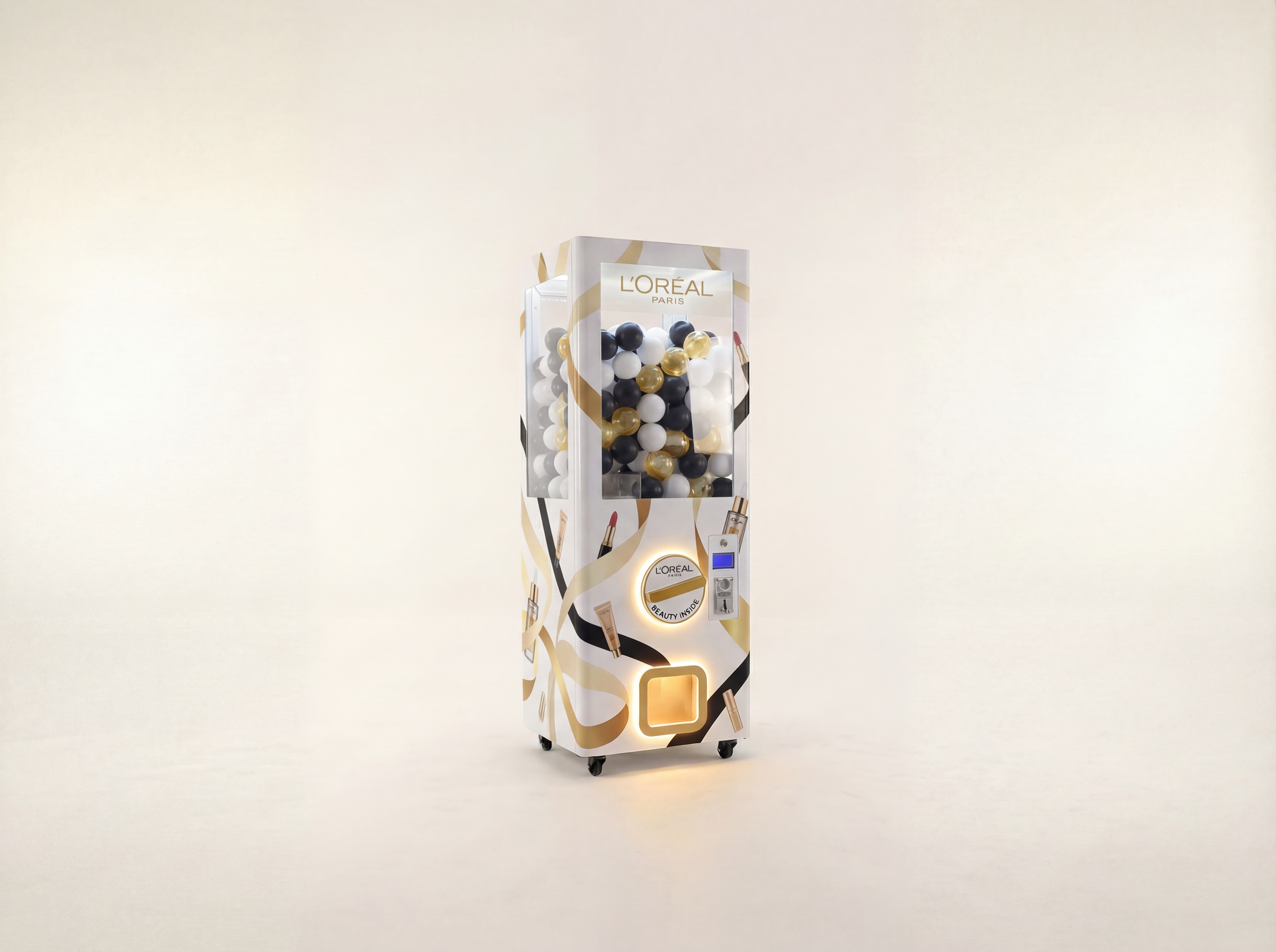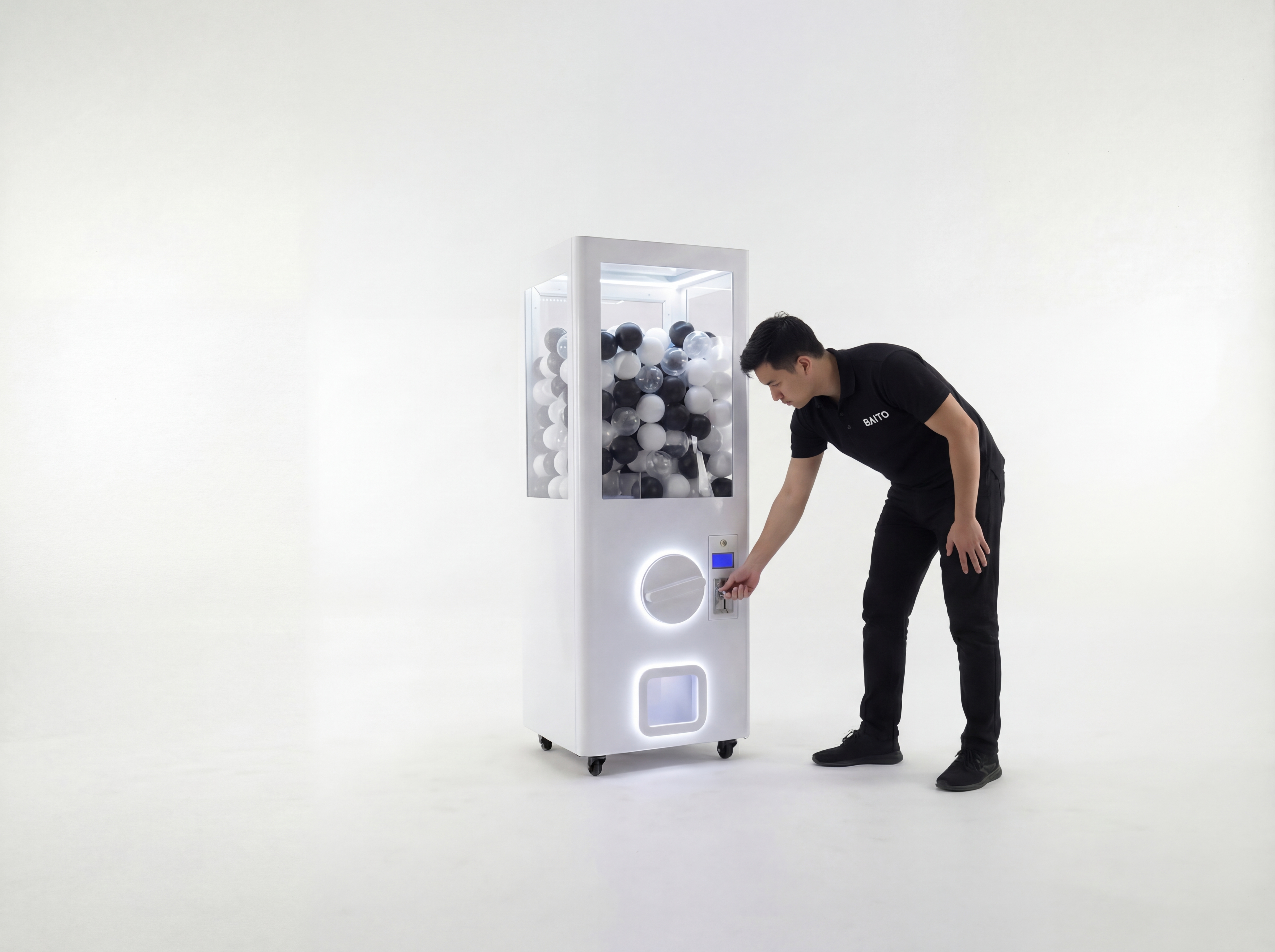 Guests insert a token (or press a button in free-play mode) and turn the dial to release a capsule containing a prize. The machine holds 300+ capsules and provides an exciting lucky draw experience.